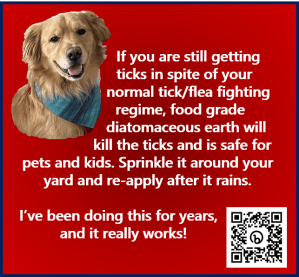 If you are still getting ticks in spite of your normal tick/flea fighting regime, food grade diatomaceous earth will kill the ticks and is safe for pets and kids. Sprinkle it around your yard and re-apply after it rains. I’ve been doing this for years, and it really works!