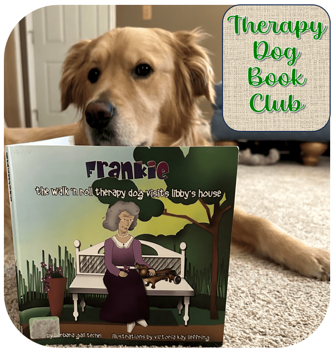 Have you read about Frankie? There’s a few books about her, including a coloring book, an activity book, and a book for grown ups, but in “Frankie The Walk ‘n Roll Therapy Dog Visists Libby’s House” by Barbara Techel, Frankie goes to visit people with alzheimers.